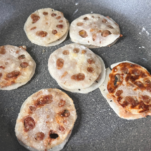 4.フライパンに米油をしき、中火で③を焼く。両面に焼き目がつくまで焼き、冷ましておく。