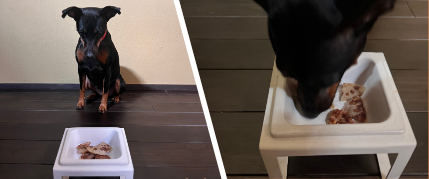 中に挟む肉だねはPOCHI ザ・ドッグフード ウェット 鹿肉とレバーのランチを使っているので、中まで火を通す必要がなくそのままでも食べられます。れんこんに焼き目がついたらOK。作るのも焼くのも簡単でお手軽です!