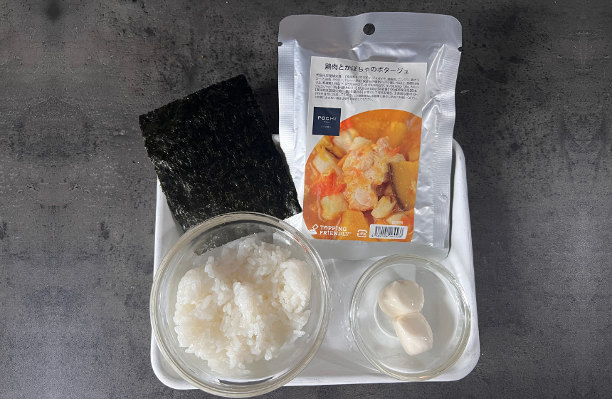 2.耐熱皿にごはんをしき、POCHI鶏肉とかぼちゃのポタージュをかけ、①のモッツアレラチーズを間隔をあけてのせる。