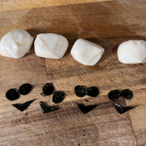 1.ひとくちモッツアレラチーズは半分に切っておく。海苔はおばけの目と口を4個分作っておく。