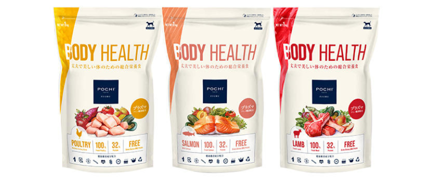 POCHI ボディヘルスは、「丈夫で美しい体づくり」をコンセプトに、病気に負けない丈夫で引きしまった体づくりと、抱きしめたくなるようなツヤ毛並みの両立を目指して開発された成犬のための次世代ドッグフードです。