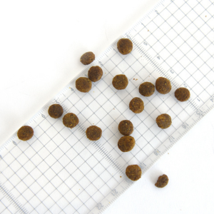 直径約8mm、厚さ約3mmの小粒なタイプです。小型犬の小さな口でも無理なく咥えることができ、丸呑みを防ぎやすい形状だと評価できます。