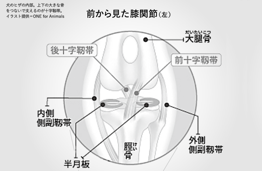 前十字靭帯というのは、ヒザの後ろから前に走っていて、スネの骨を上下からつないで支えるのが主な役割です。人間はスポーツや転倒によるケガで切ることがほとんどですが、犬の場合、日常生活中に切れてしまいます。なぜ切れるのか、原因究明には至ってなく、どの犬種にも起こりますが、特に大型犬に多い疾患です。完全に損傷する前から徴候や症状が出ます。動き始めや運動後に足をつきづらそうにしたり、ケンケンで歩いたりするので、家族もおかしいと気づくはずです。その時点で整形外科専門医のいる動物病院で診てもらえれば早めに診断がつくでしょう。目安としては1カ月の間で、歩行の際に何回も足を上げたり、かばうという不調を繰り返したら、一度診察することをオススメします。