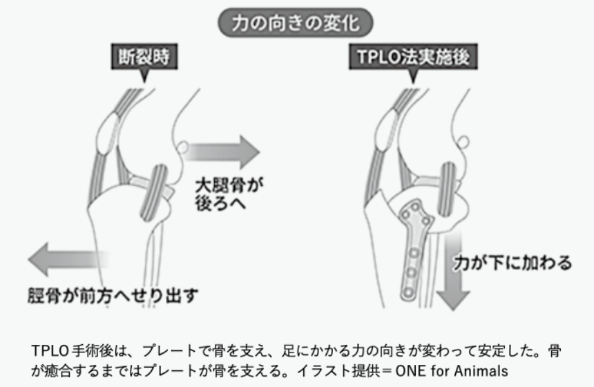 前十字靱帯が完全に切れたら、その治療として外科的手術を行うことで足の機能回復を目指します。獣医療も日進月歩ですが、現時点で、欧米で広く推奨されている手術法(TPLO)が、日本でも受けられるようになっていますが、施術者の力量が求められる手術でもあります。