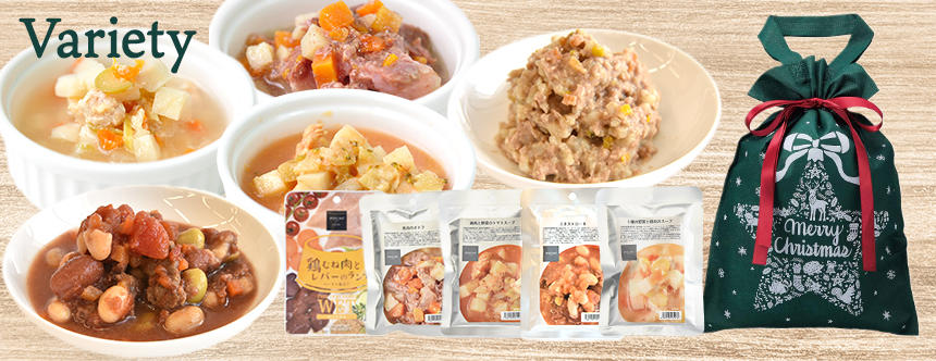 チキンに、馬肉、ミネストローネなどなど、バラエティに富んだ内容のセットになっています。