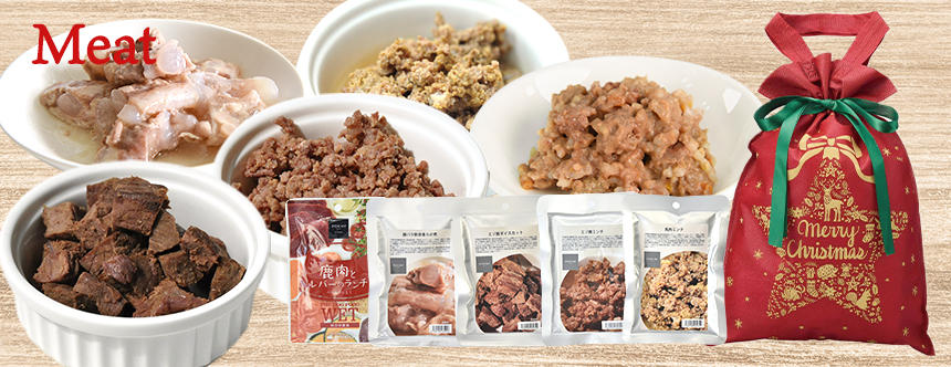 「クリスマスディナーレトルトセット ミート」は鹿肉、豚肉、馬肉、いろんなお肉のレトルトを集めたセット。