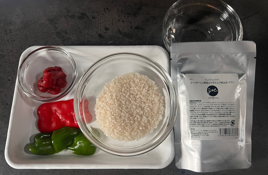 2.炊飯器に①の米、J&C プレミアムパウチ ミートボールと野菜のヤギミルク煮込み イワシ 100g、トマトペースト、水を入れ、よく混ぜたら炊く。