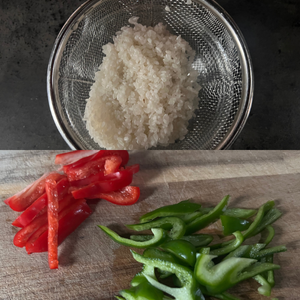 1.生米は洗ってザルにあげ、水気を切っておく。パプリカ、ピーマンを細切りにしておく。