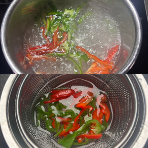 3.①のパプリカとピーマンは柔らかくなるまで茹で、冷水につけ水気を切っておく。