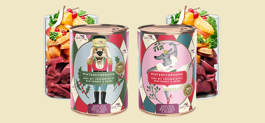 中身はガチョウ肉をベースにビーツやニンジン、サツマイモ、ブロッコリーなどの彩りを加え、クランベリーやマンダリンのフルーツの香りがアクセントになっています。