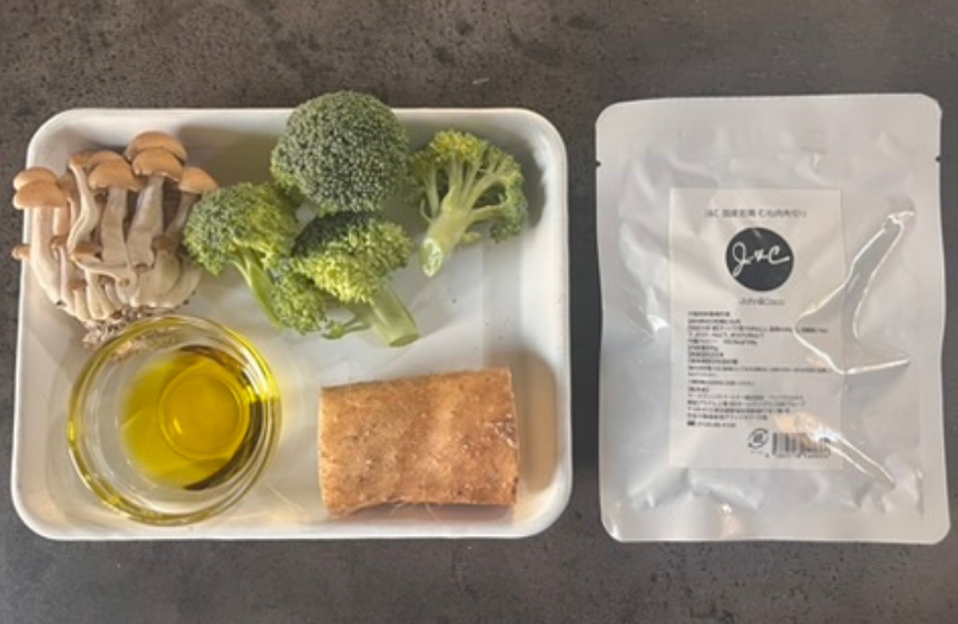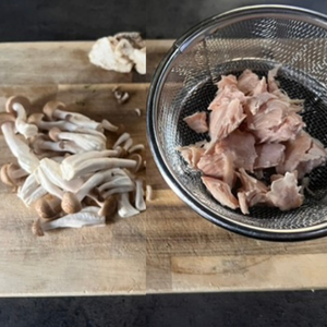 2.しめじは石づきをきり、食べやすいよう小房に分けておく。J&C 国産若鶏 むね肉角切りは汁きりして(汁はとっておく)食べやすい大きさにさいておく。