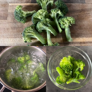 1.ブロッコリーは10個くらいになるように切り分け、沸騰したお湯で1分茹で、冷水にさらし水気を切っておく。