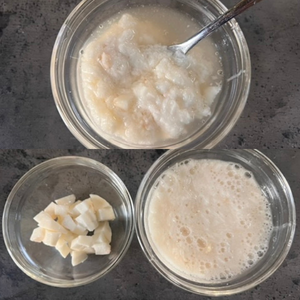 3.長芋は80gと20gに切り分け、皮を向いて80gのものはすりおろし、②の鶏肉のレトルトの汁を混ぜておく。20gのものは小さくサイコロ状に切っておく。
