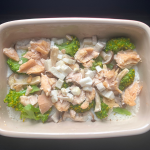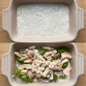 4.耐熱皿に③のすりおろした長芋を流し入れ、①のブロッコリー、②のしめじ、鶏肉を入れる。サイコロ状に切った長芋もトッピングして仕上げにオリーブオイルをかける。