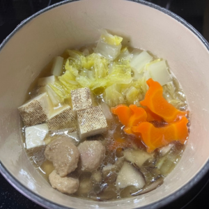 4.③に水、J&C プレミアムパウチ ミートボールスープ チキン 60g、②の白菜と人参、①の焼き豆腐を入れ、煮立てる。