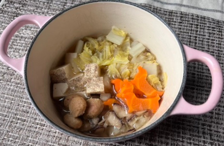 1.焼き豆腐は12等分にカットし、白菜は、2cm角くらいの大きさにカット、椎茸は半分にカットして薄切り、人参は6等分に輪切りにしたあと型を使ってくり抜く(小さくスライスにしてもOK)。