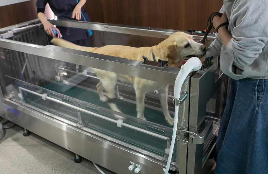 水の浮力などの特性を利用して、プールや水中トレッドミルで行う理学療法です。水の浮力によって筋肉やヒザに負荷がかかりにくく、動かしやすくなります。理学療法分野を専門とする獣医師が考えたプログラムでトレーニングを実施します。水中トレッドミルは術後3週間から、プールは術後約6週間から利用可能です。