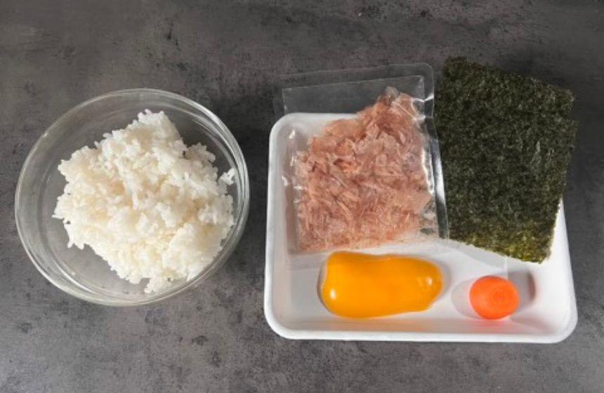 5.⑤お皿の下に残ったJ&C カツオ花削りをしき、④のおにぎりをのせて完成。