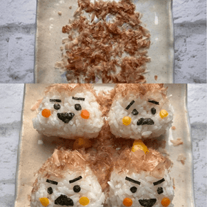 4.1個50gになるようにおにぎりを4個分作る。頭部に J&C カツオ花削り をつけ、②と③のパーツを使って顔を作る。最後に②のツノを差し込む。