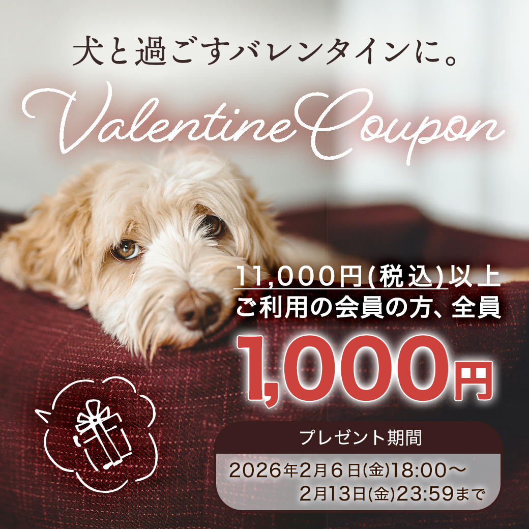 バレンタインクーポンは2月13日(金)23時59分まで使えますので、犬たちへのバレンタインプレゼントにぜひご利用ください。