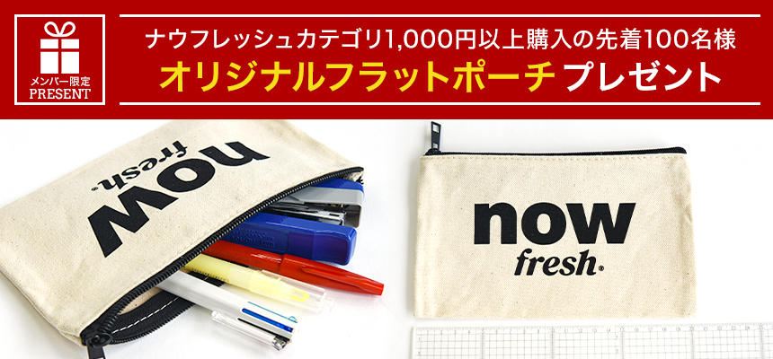 今回はナウフレッシュオリジナルのフラットポーチを、ナウフレッシュ商品を税込1,000円以上お買い物いただいた先着100名さまにプレゼント。ナウフレッシュのロゴが入ったシンプルで、小物入れにちょうどよく、インナーバックとしても使えるポーチです。