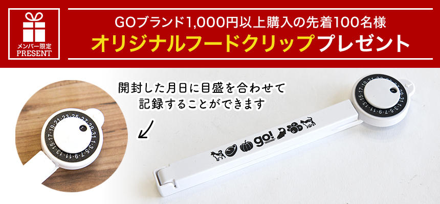 今回GOオリジナルフードクリップを、ゴーカテゴリ商品を税込1,000円以上お買い物いただいた先着100名さまにプレゼント。