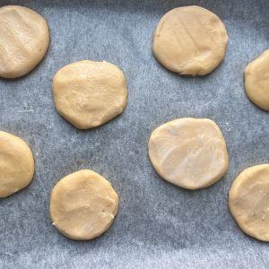 4.④鉄板にクッキングシートをしき、スプーンやヘラを使って8個分になるよう生地を落とす。指を水で濡らして、直径5cm〜6cmくらいの大きさになるように押して形を整える。