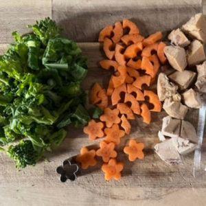1.菜の花は2cmくらいの長さになるようにきる。ニンジンは皮をむき、5mmくらいの幅にきり、花形にくり抜く。残ったものは小さくカットしておく。J&C プレミアムトリーツ 北海道産 フリーズドライ 鮭白子はざっくり小さくカットしておく。