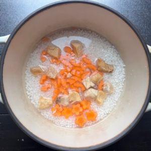 2.炊飯器に下準備しておいたお米と①のニンジンとJ&C プレミアムトリーツ 北海道産 フリーズドライ 鮭白子を入れ、1合のメモリまで水(分量外)を入れ、通常炊飯する。(花形のニンジンはあとで取り出すので、端にまとめてのせる)