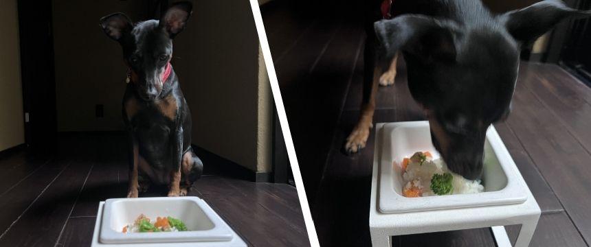 炊飯器の蓋を開けた瞬間、鮭白子の香ばしい香りと甘いにんじんの香りに鼻をピクピクさせてキッチンへ猛ダッシュ。冷ましている時間も待ちきれない様子で尻尾をブンブン振り回していました。旬の菜の花を添えていただきます。器に顔を突っ込んでハフハフ食べている様子を見ると、相当美味しいようです。お腹いっぱいになって大満足でした。