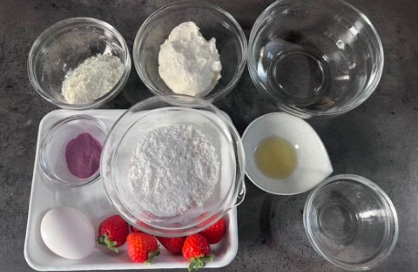 5.いちごはへたをとり、半分に切っておく。