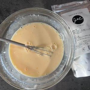 2.別のボウルにぬるま湯、ヤギミルクを10g入れ混ぜしっかり溶かす。卵、レモン汁も加え、しっかり混ぜておく。