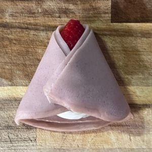 8.⑦を半分に切り、重ねて広げ、中央に④を20g程度のせ、⑤のいちごをクリームの真ん中と上に置く。