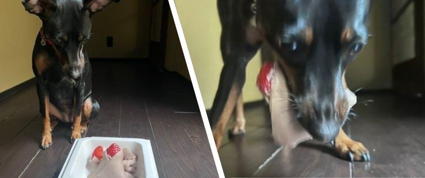 大好きなヤギミルクの匂いがして、キッチンで待つうちの子。今日は女の子が主役のひな祭りなので、贅沢なおやつを食べましょう!頑張って作ったお雛さまクレープは、一瞬で口の中へ(笑)もちもちの生地とヤギミルクの風味に甘酸っぱいイチゴの組み合わせが最高の様子です。切ったものもあげてみて、どっちもよく噛んで味わって食べていました。