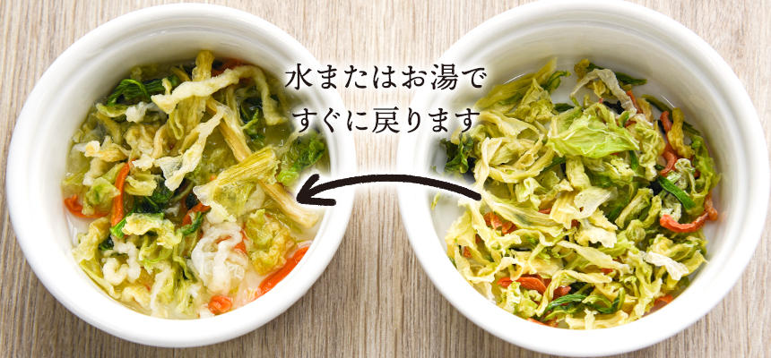 契約農家から直送された国産のキャベツ・ニンジン・小松菜・大根を、食べやすい大きさにカットしたあと乾燥させ、ミックスしました。