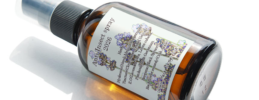 一般的なハーブの虫よけスプレーはエッセンシャルオイルをアルコールや界面活性剤で水に溶かしたものが多いのですが、 「アンチインセクトスプレー」は、原料にはフランス政府認定ECOCERTによりBIO(オーガニック)品質認定を受けた、メディカルグレードのハーブ。ただしエッセンシャルオイルは必要最低限に抑え、 ハイドロゾルやティンクチャー、さらにはバッチフラワーレメディーまでを加え、安全性を重視したフィトセラピスト渾身のブレンドで作っています。