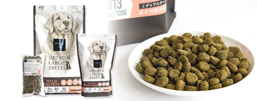 雑誌「RETRIEVER」との共同開発という形で誕生した「POCHI ミディアムラージブリード」に、待望のお魚フード「ワイルドサーモン」が新登場となりました。