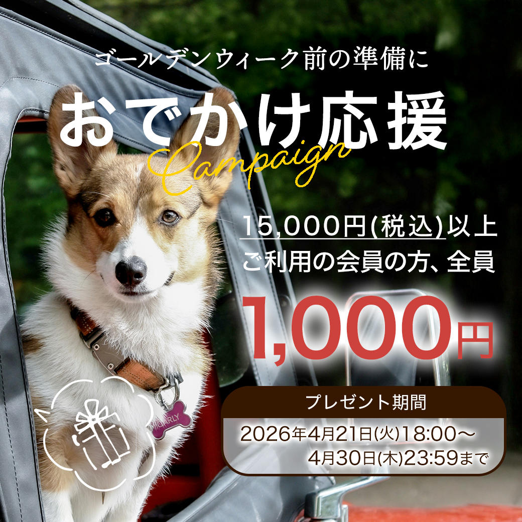ゴールデンウィークの休日に、犬たちと一緒に思いっきりたのしんでいただくために、おでかけ応援キャンペーンとして1000円クーポンをプレゼント。