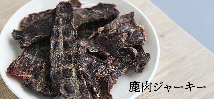 モモやネック、ロースやヒレなどの高級部位を含む鹿肉を使用した高タンパク・低脂質なジャーキー。