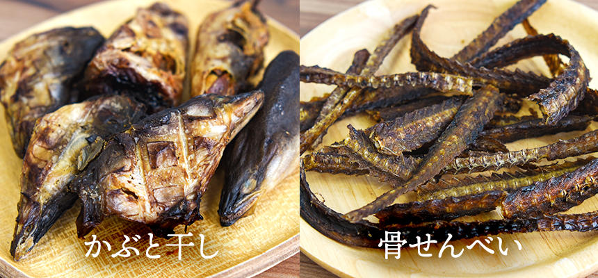 臭みを取り除きじっくり乾燥させた「かぶと干し」と「骨せんべい」の2種類です。