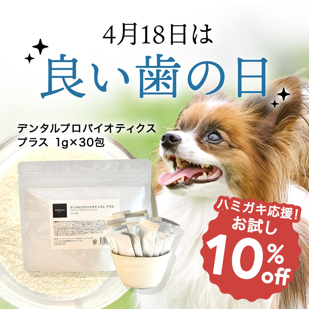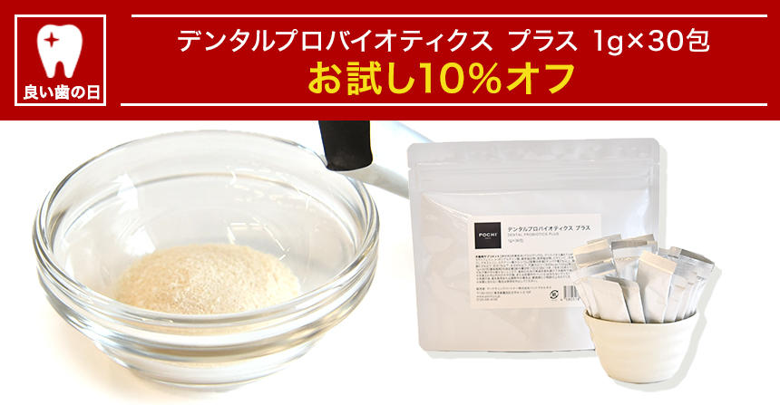 POCHIでは「良い歯の日」に合わせて、おなかもケアできるデンタルケアサプリメント「POCHIデンタルプロバイオティクス プラス」をお試し価格10%オフでご用意。