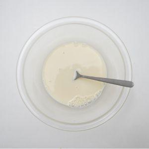 b-2. 耐熱ボウルに無調整豆乳を入れ、電子レンジで500wで40秒加熱し、b-①を溶かしておく。
