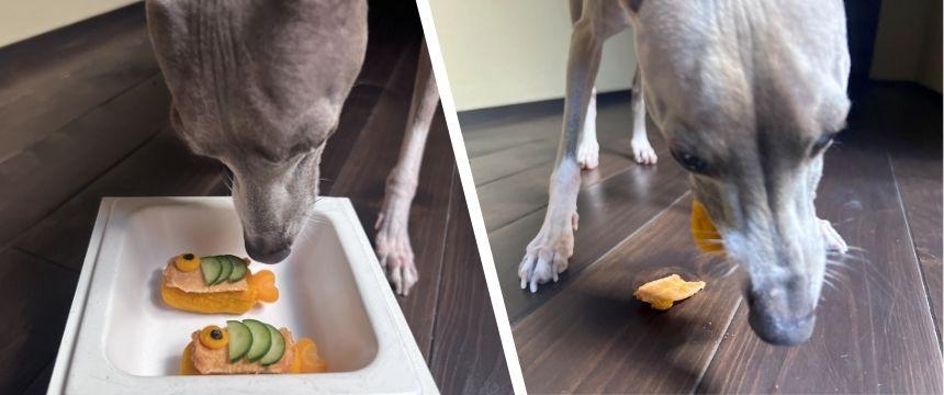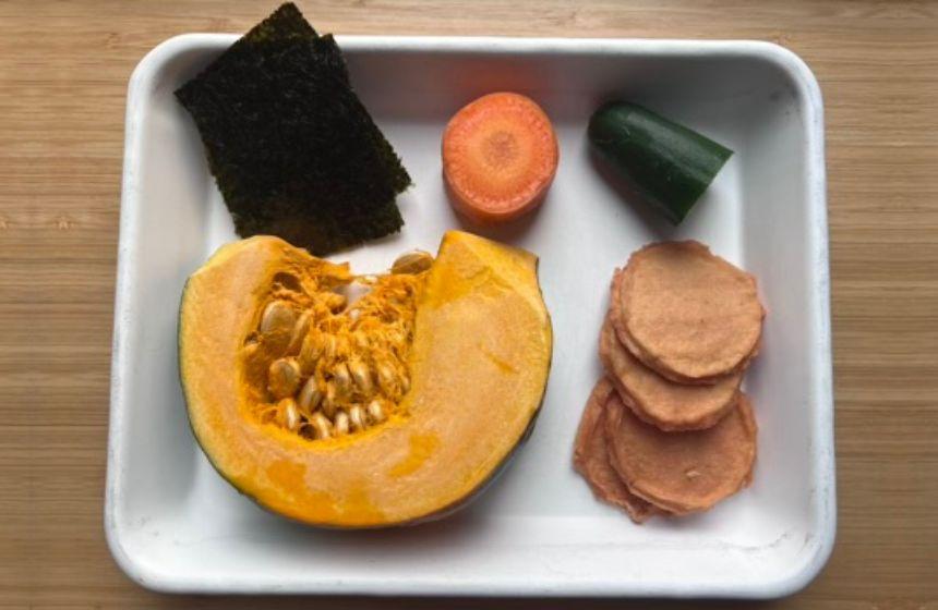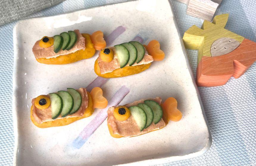 カボチャは熱いうちにマッシュし、水分を飛ばして少し硬めに仕上げます。俵型に成形した上にささみサラミジャーキーをのせ、キュウリやニンジンを使ってうろこや尻尾、海苔で目を表現。ささみサラミジャーキーは割れやすいので、割れ目に沿って包丁で叩くように一気にカットすると綺麗な長方形に仕上がります。