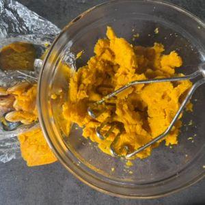 1.カボチャが柔らかくなるまで電子レンジで加熱する(500W4分)種と皮を取り除き、滑らかになるまでマッシュする。