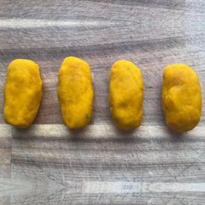 2.①を少量とりわけ、残りを俵型に4つ成型する。(寿司のシャリをイメージして)