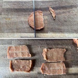 3.J&C プレミアムトリーツ 鶏ささみサラミジャーキー は割れ目に包丁を入れ、一気にカットする。(割れやすいため)