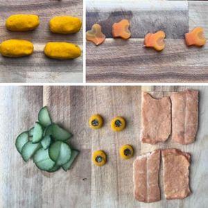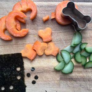 4.ニンジンは尻尾になるよう型やキッチンバサミをうまく使ってカットし、柔らかくなるまで茹でて冷ましておく。キュウリは半分にして薄くカットしておく。海苔は目になるように小さい丸を4つ作っておく。