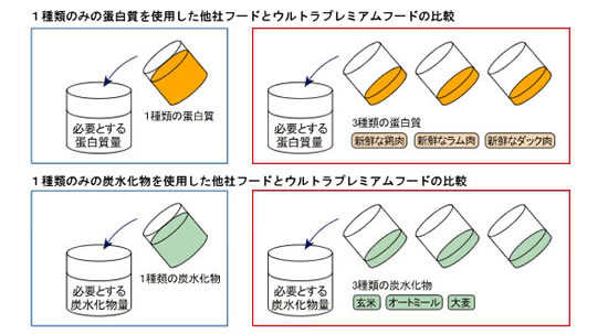 ウルトラプレミアムは、アレルギー症を予防するために、3大栄養素である蛋白質(鶏肉・ラム肉・ダック肉)、