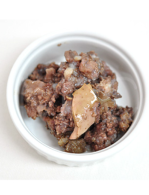 ※写真のように、馬肉の下に「いつものフード」を敷いてもOK。食べる頃には柔らかくなっています。