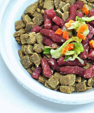 ※写真のように、馬肉の下に「いつものフード」を敷いてもOK。食べる頃には柔らかくなっています。
